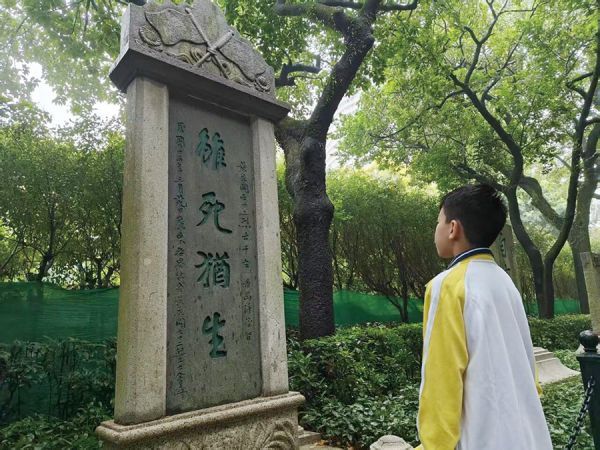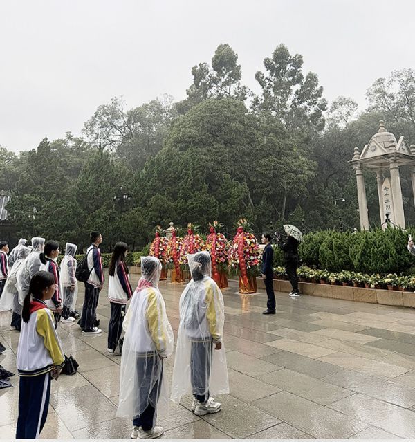 在黄花岗七十二义士墓园内,300余位师生与家长一同惦记逝去的本族,请安永恒的英烈。雨点敲在伞面上,顺着睫毛滑落,仿佛天外也在无声垂泪。
