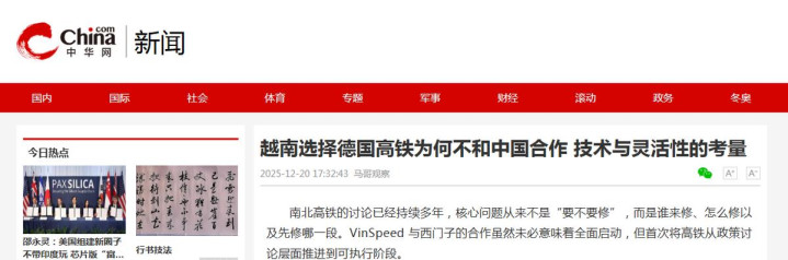 中华网 2025-12-20 越南采选德国高铁为何不和中国相助 时刻与天真性的考量